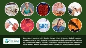 Stress doesn’t have to be only related to lifestyle. In fact, stressors to the body are more insidious and can be more damaging. These include a diet high in sugar and starchy foods, not eating enough or eating too much, gut problems, food intolerances, high or low blood sugar, diabetes, anemia, autoimmune disease, chronic pain, and environmental toxins.