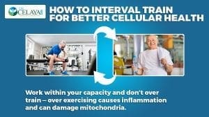 To interval train  simply push yourself to your maximum effort for several minutes several times in your routine, with short periods of rest in between sets. Work within your capacity and don’t over train — over exercising causes inflammation and can damage mitochondria.